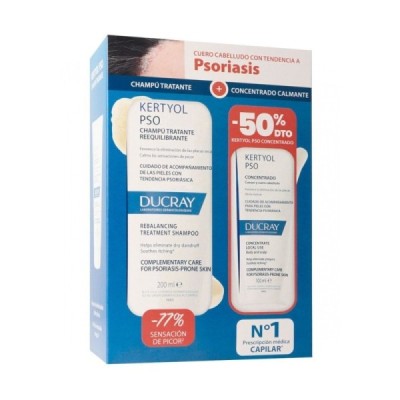 Descripción: El Pack Kertyol P. S. O Champú Tratante + Concentrado Calmante de Ducray ofrece un tratamiento completo para combatir la psoriasis en el cuero cabelludo. Actúa reduciendo el espesor de las placas, eliminando las escamas y aliviando las rojeces y el picor desde la primera aplicación.