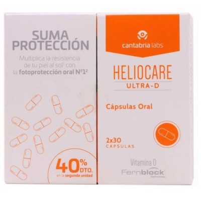 Fotoprotección oral con vitamina d, que complementa la fotoprotección tópica. Contiene fernblock como su principal y patentado ingrediente, con eficacia fotoinmunoprotectora, antioxidante y reparadora del daño solar. Combinado con otros ingredientes que refuerzan su actividad antioxidante y fotoprotectora, vitaminas c y e, licopeno y luteína (protector de la mucosa ocular). Contribuye a frenar y reparar los daños protegiendo frente al fotoenvejecimiento, la aparición de manchas y otros daños derivados de la exposición solar. Aporta una protección uniforme y homogénea de toda la superficie corporal llegando a zonas como ojos, mucosas, pelo, donde no llega la fotoprotección tópica. ¿para quién está indicado heliocare ultra d cápsulas oral? está indicado: - en pieles con especial intolerancia al sol. - pieles muy claras. - pieles con manchas cutáneas. - pieles con fotoenvejecimiento. - pieles sometidas a tratamientos fotosensibilizantes. - pieles con daño actínico. - pieles reactivas. Heliocare usa tecnoloía fernblock fernbloc es el activo patentado, base de heliocare. Extracto exclusivo estandarizado de polypodium leucotomos, un helecho tropical de américa que pasó de la vida acuática a la terrestre. Polypodium leucotomos tiene una acción potente protectora, antioxidante y reparadora de la piel. Funciona tanto por vía oral como vía tópica. Sus principios activos actúan sobre las cuatro radiaciones uvb, uva, ir y visible. Evita daños inmediatos, como quemaduras. Evita daños a traves del tiempo como manchas, envejecimiento de la piel, alergias, pérdida de defensas de la piel incluso cacer de piel. Heliocare ultra d cápsulas oral es un producto de cantabria labs. Advertencias: mantén fuera del alcance de los niños. Conserva en un lugar fresco y seco. No se debe consumir el producto y se debe usar con precaución.